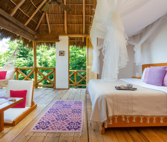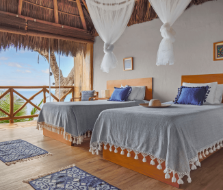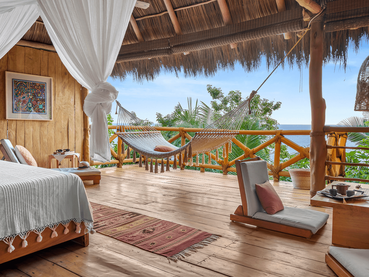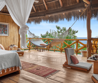 Xinalani offers beautifully designed, eco-chic accommodations that blend comfort with nature. Each open-air palapa is thoughtfully built with sustainable materials and perched along the hillside, inviting the ocean breeze and the sounds of the jungle in. Rooms feature comfortable beds with mosquito netting, private or shared bathrooms, and spacious balconies or terraces with stunning views of the sea or lush greenery.